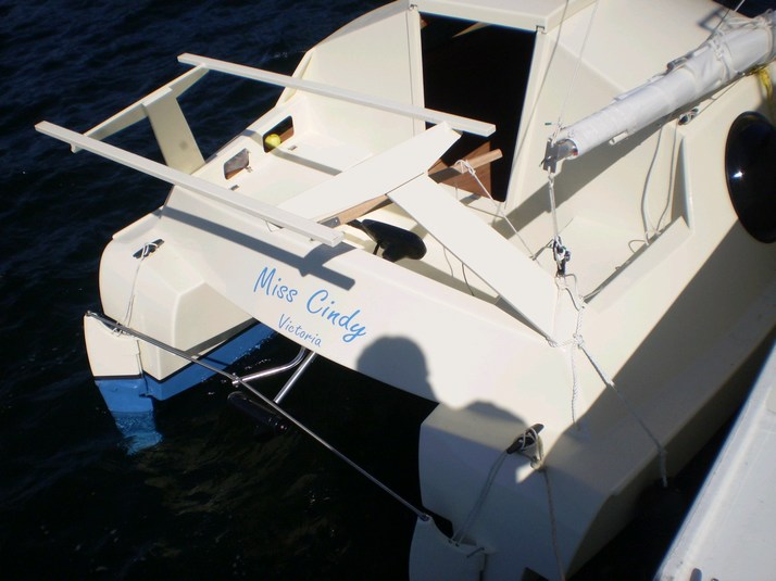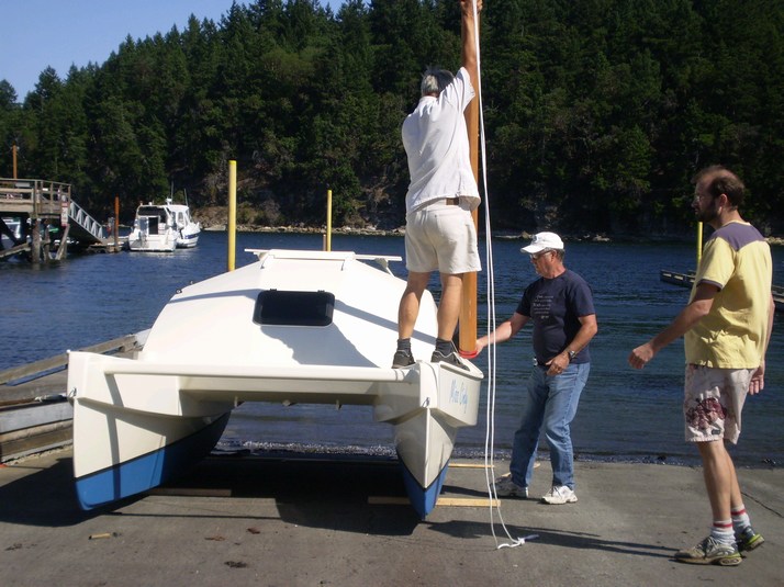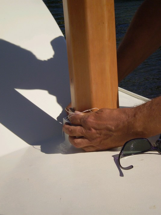 Rigging the starboard boom. I have only finished one sail and as it is blowing 25-30kt that should be enough for a maiden voyage.