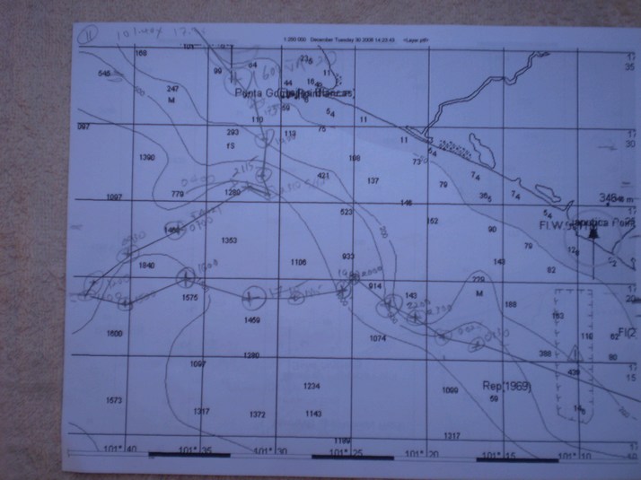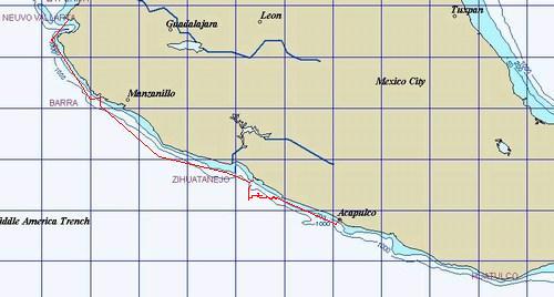 Next day we were 23 miles offshore and the winds were still light South East. Looks like the forecast was wrong. At 1400 I decided to return inshore probably with our next stop Acapulco. We motored in the light adverse winds for 5 hours to get inside the shipping lanes before dark. We had a nice 5kt NW breeze for most of the night which died early in the morning. We were now about 10 miles South of where we had been 24 hours ago.