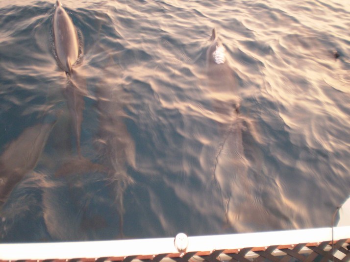 As we are churtling along another pod of dolphins come and play up near the bows. I configure my harness in long mode and take some photos from the bow deck. Then I put the camera away and see if I can touch one of the dolphins. As I lie on the net they move forward a few feet and their tails are below but too deep in the water. After a minute they coast back and I touch a couple of them. They don't seem to mind.