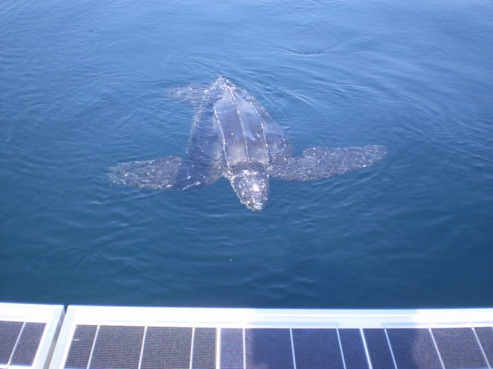 Some where on our 92 hour passage to Zihuatanejo a big leatherback turtle comes over to us as we ghost along. He swims along after us. Perhaps he has a thing for 'Miss Cindy'.