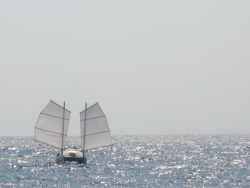 The breeze fades, the dolphins leave, there is just starlight, Venus glow, and an occasional flash from the lighthouse 5 miles astern. I turn on the navigation lights , trim the sails to the coming breeze and carry on.