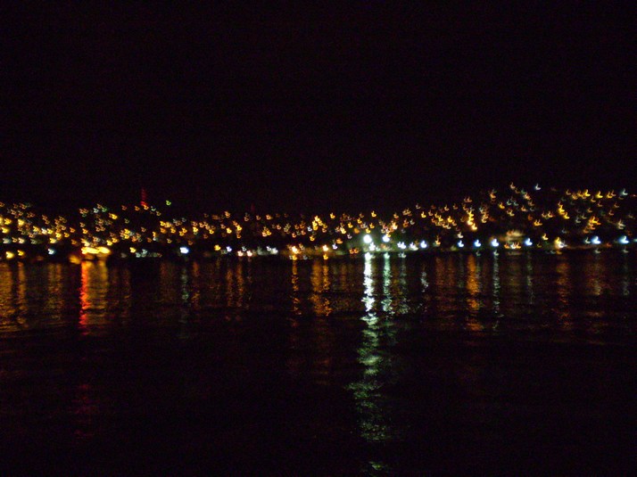 As we approached the little bunch of lights I looked up the coast for the glow of the city but could see nothing. At 15 miles it was clear as the bunch of lights enlarged that it had been Acapulco all along. At this distance it looked like a glittering gilded alligator gliding over the waters, with its head to the right, the shallows of its neck, rising ridges on its back, and finally a tapering tail. It only started to loose this clear appearance a couple of hours later.