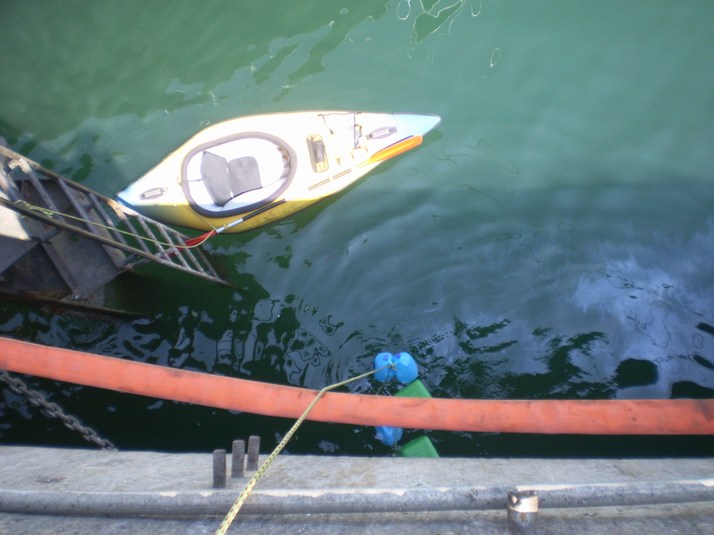 With a rope I drop my 3 gallons of water and 5 gallons of gas into the water beside the kayak and clamber on down. ( Unauthorized port photo )