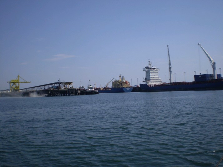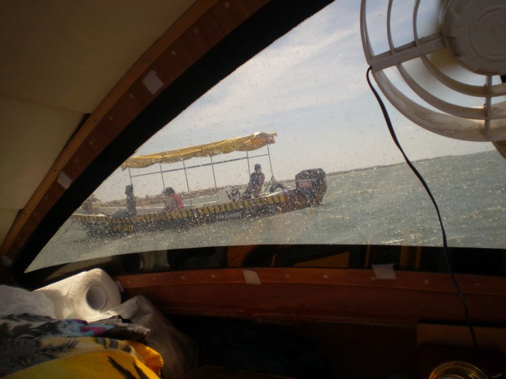 On the way to the Barillis pilot meeting point there seemed to be a weird nav light on the bank to the West. It flashed regular yellow but when we approached it the light went to a xenon bright blue. I thought at first it was a panga but with my light on it it just looked like a buoy. It seemed to be able to sense our approach. We have anchored overnight at the meeting point for the pilot who will guide us over the bar and up the estuary to Barillis. The tide is going in and the bar should be friendly but I have packed my papers and journal in a water proof bag and tied it on my waist. As well I have the hatch boards ready to put in when we get to the bar. The pilot shows up at 0715 and I explain our limited speed and the need to refuel every hour and off we go. There is a panga driver and a pilot in a uniform complete with army boots.