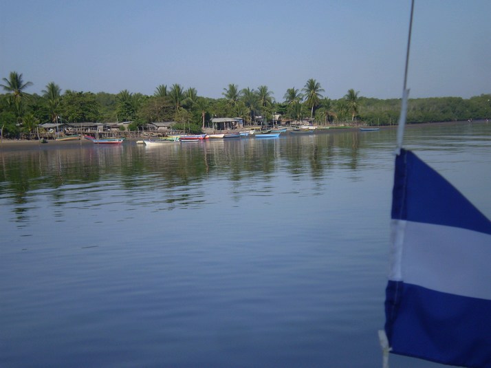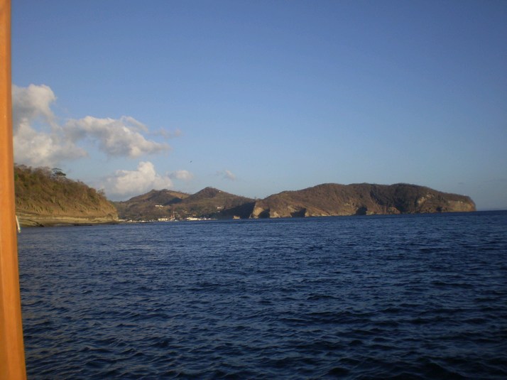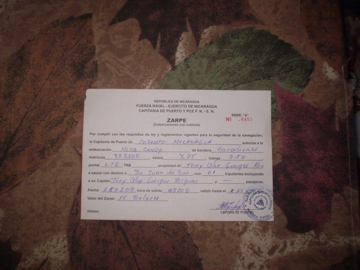 We check in around 1600 with left to right, Port Capitan ( I briefly entertain a fantasy of good looking women in uniform), Immigration, Harbour Master, Customs. The Port Capitan compliments me on bringing such a small boat here in these winds. I check out with a national Zarpe for San Juan del Sur at the same time. All of this comes to US$37. I pay and the Immigration guy is a bit taken aback by the US $2 bill I throw in for fun, I give him a big smile and two 1's instead. He notes one is torn and I replace it. I ask the Port Capitan about ports in Lago Nicaragua and she phones someone and advises that I will need to get permission from the minister of aquatics ( or some such ) and that I can do that thru the Port Capitan in San Juan del Sur.