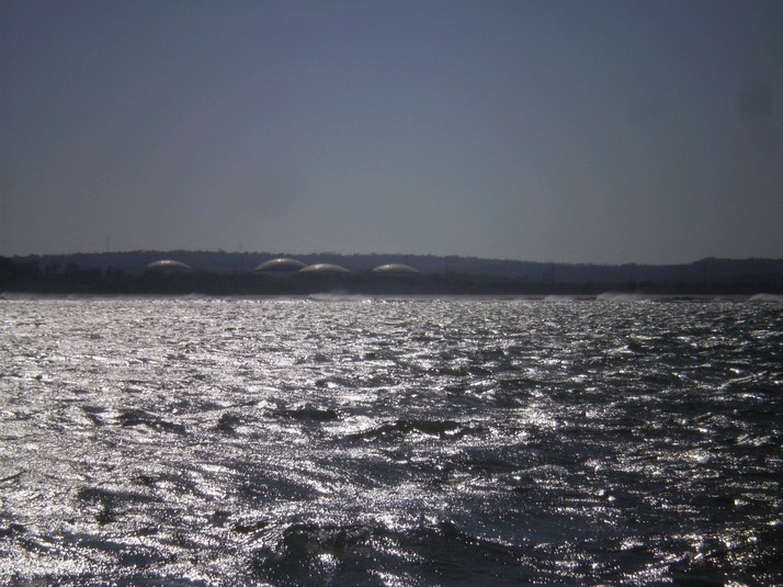 And it is windy windy windy. We pass Puerto Sandino, formerly Puerto Somoza and anchor just past the port in the lee close to shore. Those are not flying saucers but oil storage tanks.