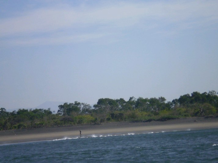 0600 There was a panga moored about 1/2 way to the beach in front of us that came to light a dawn. We sail off with just the windward sail up, it is mostly 15 kt but gusting hard to 25 sometimes. We track along the coast to Puenta Ampala. This looks a bit like the place the tank landing ship operated out of. As this feels like just a strong morning land breeze we head across the Golfo de Fonseca. I steer towards Volcan Cosiguina in Nicaragua. It is about 20 miles across the gulf. This is one of the areas on this coast where we are exposed to risk from Nortes. About 8 miles in the wind has steadied out around 15 kt so we get both sails in action on a nice reach. With 8 miles to go we are down to a single reefed windward sail. It is blowing a hard 30 kt with some stronger gusting. We are now headed towards Puenta Cosiguina. We are making a steady 6 kt. This is looking like a Norte. We anchor about 2 miles North of the point in 20 feet of water around 1100 and settle in to see what happens.