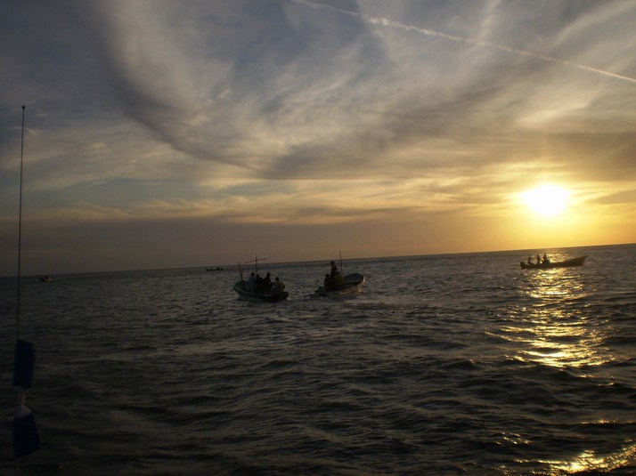 We make it to El Transito and anchor mid afternoon for the night as the wind continues to blow. I chat with a panga headed to the beach around 1600 and give them a PangaPak, and decline their offer of fish. This is the first PangaPak I have given out at anchor. That was a mistake. Around 1800 all of those boats on the beach head out to go fishing for the evening and most of them come by to say Hi. A couple ask for stuff and I explain 'little boat, many pangas' and they are good with it. I am surrounded by about 10 at one point. Lots of ordinary chat as well, how far out do they go, where am I from, will I be here tomorrow.