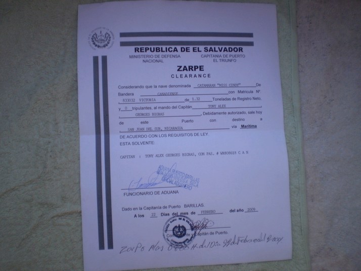 Our exit Zarpe for El Salvador, we are the 'Catamaran Miss Cindy'.