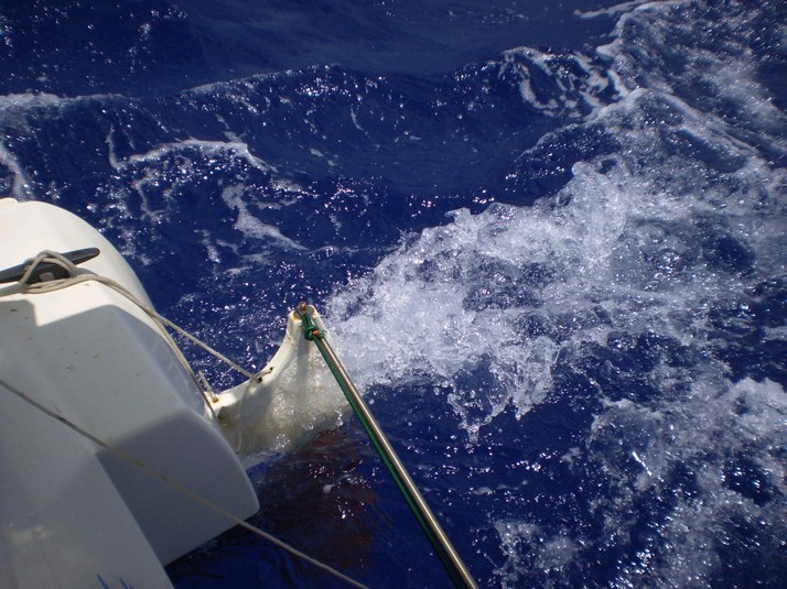 There has been lots of flotsam. I took a small log between the hulls and was his pet fish ever surprised, looked like a 10 pound mahi-mahi. I past what I thought was a childs toy but it was a sailing jellyfish with an inflatable purple sail with little dimples on it. So neat but in the wake before the camera was ready.