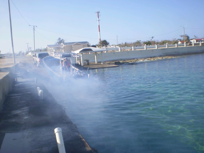 Next morning rather than having to call customs to clear out I notify them as they are launching a boat at 0730 to take them to Little Caymen. It is a giant panga they found adrift with 2 200 HP and 1 250 HP motor. Its fuel tanks are 440 gallons. It starts up in a cloud but the good news is that customs will clear me as soon as they get back from Little Caymen, around 1700.