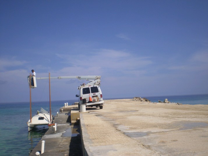 Isla Provedinca. After a couple more hours of sailing we motor due East. Another shear pin fails. The new ones are slighty smaller diameter and have been lasting about 15 hours on average. I have 7 more spares. The replacement Attwood bi-colour light failed last night. Bummer. Looks like it had about 50 hours on it, supposed to be good for 50,000. I entertain a fantasy of getting some fedexed to Cayman Brac. More likely we will just run with our all round white and turn on the nav lights when we sight traffic. This harbour has an interesting entrance. Port and Starboard lighted buoys close in to shore. When you get thru them, hard to Port into the harbour. Rocks straight ahead if you forget to turn. There is a reef off to Port before the buoy too. We chug in.