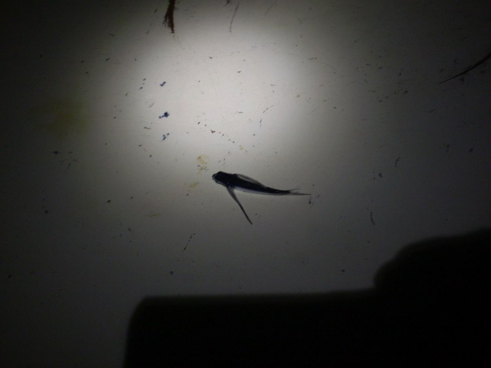 There has been one pod of dolphins and not much else except for a kazillion flying fish. Whole schools take flight sometimes. Only one comes aboard. He is too tiny for the pot so I put him back.
