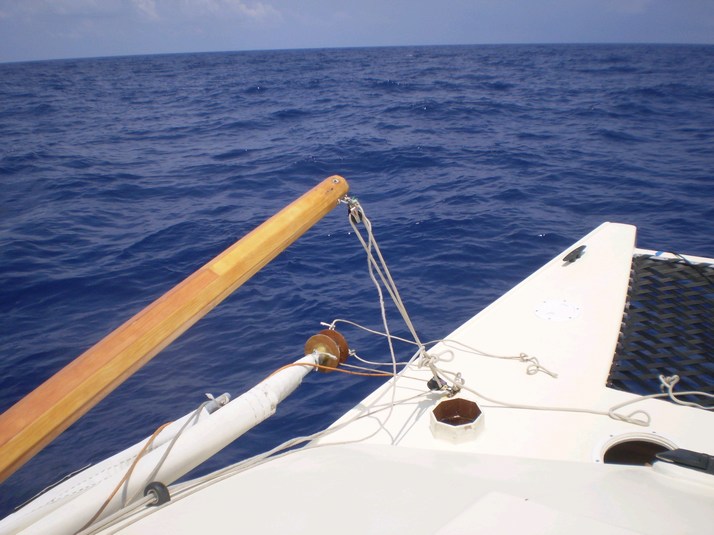 The tiller head was worrying me too. It is also under designed. Not enough bearing surface or a big enough bolt. It has egged the holes on the tiller post and on the tiller head itself. Before every major passage I have been disassembling it and gooping it up with epoxy to tighten it up. On the long port tack to Cayman Brac I did it at sea about 4 days out. By mid morning it is pretty sloppy and does not produce the crisp steering the conditions require. Around noon the breeze drops to 15kt or so. In an hour the waves are all more friendly and surfable with out excess speed.