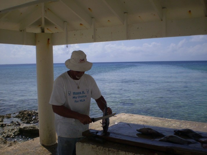 Sitting on the customs mooring buoy I had a nice piggy back wifi signal. Customs called me up on VHF 16 and asked me to bring 'Miss Cindy' into the little boat basin. I had not even noticed it thinking there was only a boat launch ramp there. It is a tiny little cut in the coral about 20 feet wide opening into a basin about 50 x 100. It felt very tight for me going in but they claimed to have had a 40' sailboat in there. The health inspector sprayed something in the boat related to their mosquito control and monitoring program and collected his CI$25 ( US$31.25) fee for that. Customs and Immigration had no fees for entry, but I had to fill out the forms myself rather than my experience in Mexico and Central America where the official fills them out. After the declarations the Customs guy came aboard. He had the full uniform except for the black boots, he wore more practical sneakers. They thought my home made flag was cute.