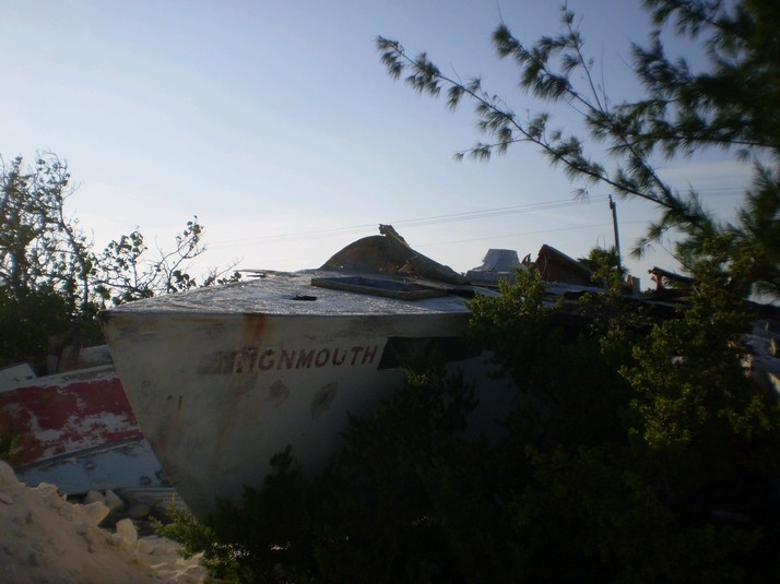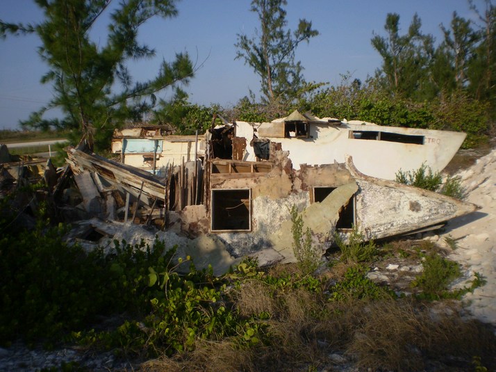 I see it. It lies on a pure white sand with chunks of coral lying about. There is a bunch of vegetation overtaking it. It is broken apart and twisted, but it is what I have come so far to see.