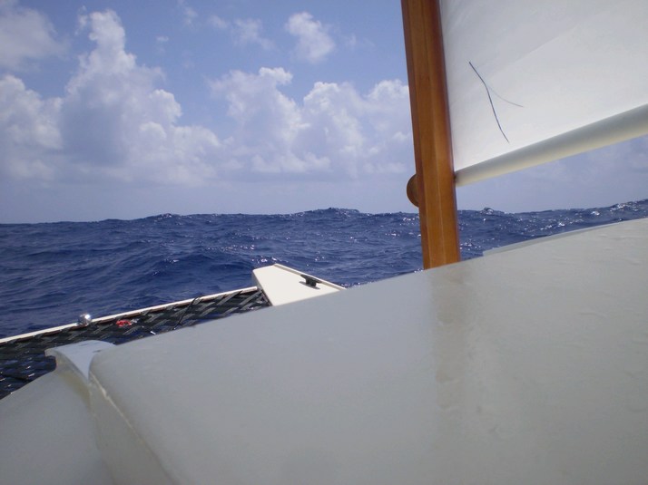 We motor another hour and it is back to sailing on port tack. Just North of Jamaica a nasty South West current show up. Looks to be about a knot and we are now making North West. This carries on for the rest of the day. We have the heaviest weather in this period. I reef to keep enough power for driving into the 10 to 12 foot seas but not so much we launch off every one. We only launch about every 10 minutes. The launch is not too bad but the falling thru space, sometimes at a diagonal angle is not too much fun. Nor is the landing. I remind myself that I have tested the design of the glass tape joints and they are stronger than the plywood they hold together. By this point we are almost as far West as Grand Cayman. I however have no intention of pulling in there and advise 'Miss Cindy' we will tough it out together.