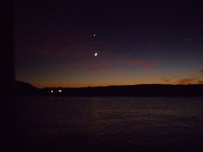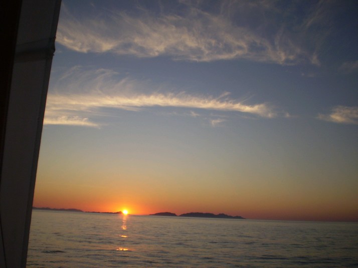The night is spent navigating down a 4 mile wide channel with hard stuff at the edges, in light winds mostly adverse but later coming from astern. Kind of peaceful ghosting in calm seas with a little chuckle from the sterns and the loudest thing from inside the cabin is the tick tick tick of the clock.