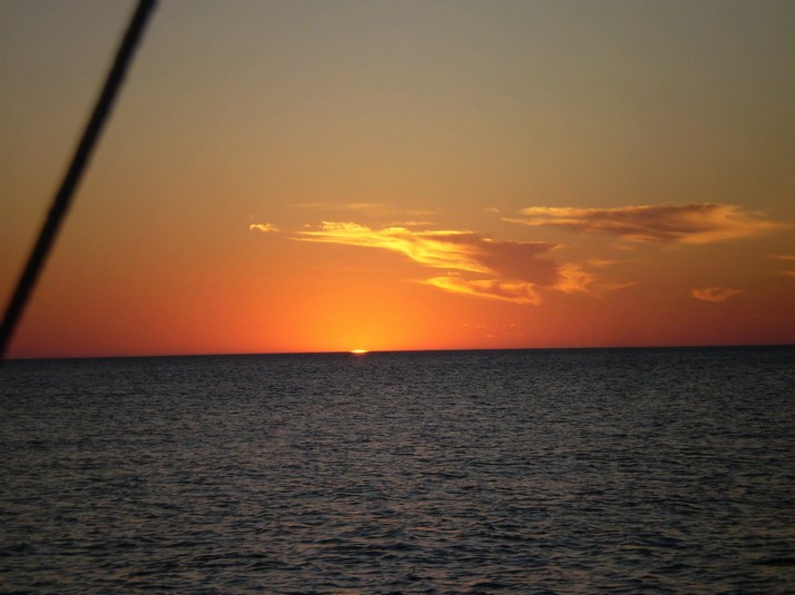 Around 0400 what looked like a big manta ray drifted under the boat with a big square of phosphorescence. That was a bit un-nerving. Turned out to be some dolphins having a joke as they split up and played a bit around the bows even though we were just poking along at 3kt. A few minutes after they left there was another big shooting star, a brilliant green flare falling slowly and lighting up it's smoke trail.
