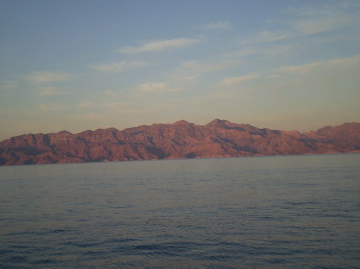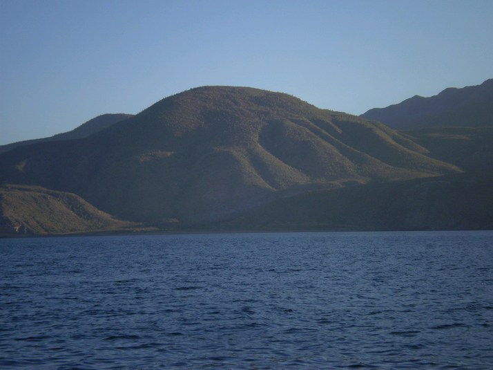 Cabo Virgenes is 15 miles away. Anchor for the night about 6 miles NW at Pt Santa Ana, about 300' out from a sheer cliff in 40' nice sandy bottom. Took bearing for exit from the bay in case some NW shows up overnight. At night there are about 10 pangas in view all using spotlights to fish. Total time anchor to anchor is 38 hours.