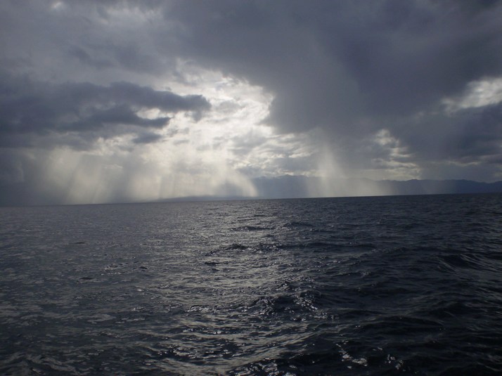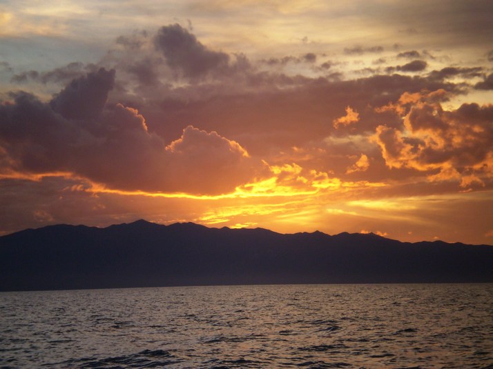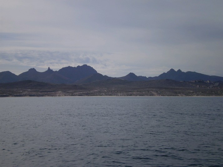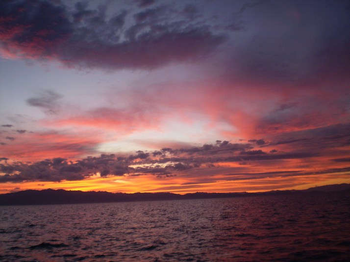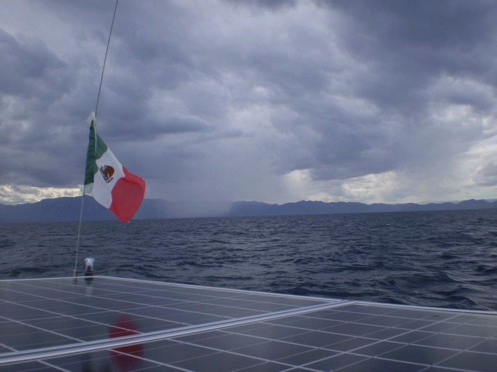 Around midnight a little stronger breeze came up from the North and I headed out on it. As I cleared the wind shadow of the cliffs it doubled in strength. It mellowed a couple of hours later but we still moseyed along. Around 1000 we had left the canal and entered the sea. Dodged some serious rain and watched Baja catch on fire as the sun went down.