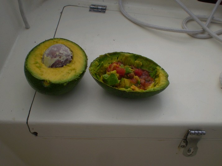 At sunrise sighted the mainland. Still on a reach headed East with 'Miss Cindy' doing the steering for the past 20 hours. We had three gybes in that time which is not too bad. I ate some more of the brownies I got from the crew on 'Swamp Angel' another BC boat in La Paz. After that I ate a giant avocado with salsa and tostadas, yum.