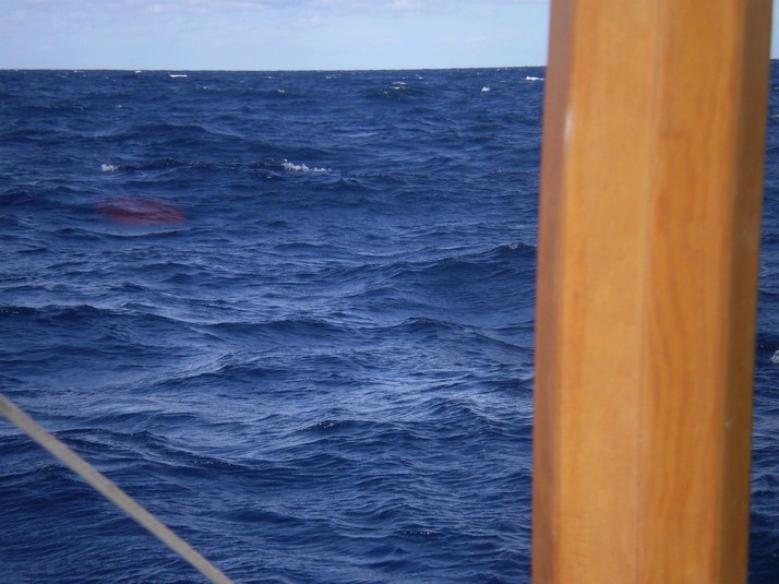 The wind remained wishy washy till midnight when a steady NW 15-25 settled in. Could not get 'Miss Cindy' to self steer satisfactorily with the wind angle and the big swells and surfing. We were beam to close reaching and there was lots of spray and wave slap particularly against the hull sides. I was tired and set the parachute anchor off the bow and went to sleep around 0500. By 0700 was underway again with the waves looking more friendly in the daylight. At that time Mazatlan was 150 nautical miles away. I set the para anchor again at 1030 and got some more sleep. A couple of hours later heading more Easterly I got the sails and helm set to self steer. It was noisy below and wet on deck but we were making a good course and rate and somebody else was steering.