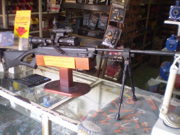 A bit of Christmas advertising in the local hardware store. The sign on the sniper rifle says 'Para Esta Navidad contamos con sistema de apartado'