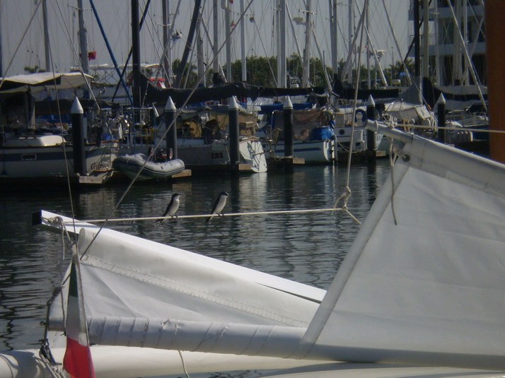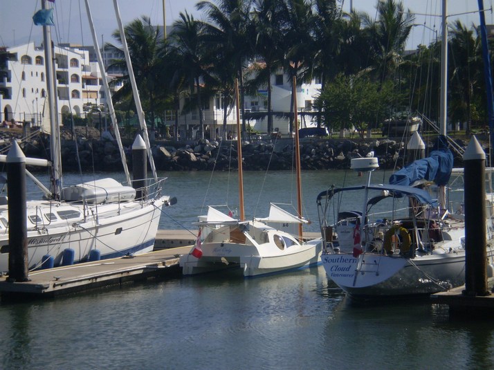 Signed off and headed in thru the breakwater and tied up at the Marina Neuvo Vallarta to a rotten concrete dock with bits of metal sticking out. I called up Paradise Village again hoping perhaps we could shift 'Miss Cindy' there after Christmas. Spoke with Gina this time and there would be no space available during the next month. Dick in the background asked if we were the 16' catamaran. I said yes and he asked us to stand by for a few minutes. Dick said he could fit us in today and would move us to another slip tomorrow for the rest of our stay. We shifted over into our temporary slip. Guess he had seen the pretty lady come in.
