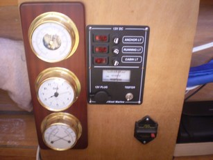 House battery is a U1 30 amp hour gel. Cheap West Marine panel with meter and lighter plug. The cabin light indicator died after a month but otherwise works fine. The Weems and Plath instruments should have been a wristwatch baromenter probably. This unit is fairly heavy and the hygrometer has not worked from day one despite recallibration per instructions. Heavy breaker goes to solar panel.