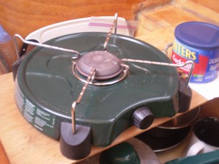 One burner propane. Have not use much but no problems. Uses external 5 lb propane tank. Pretty heavy tank configuration, I should have just got 4 or 5 1 lb cans that attach direct, would have saved 15 lbs.